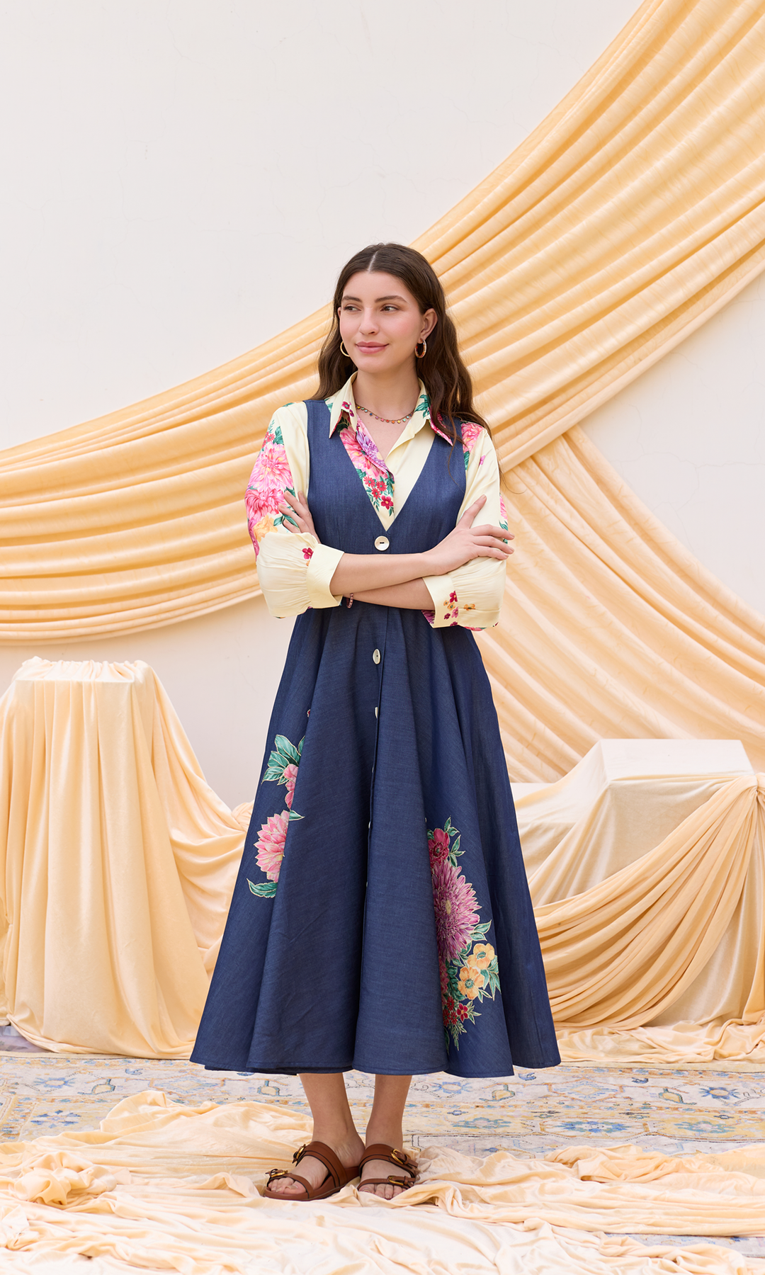 Heidi- Denim Patchwork Dress with digitally printed shirt