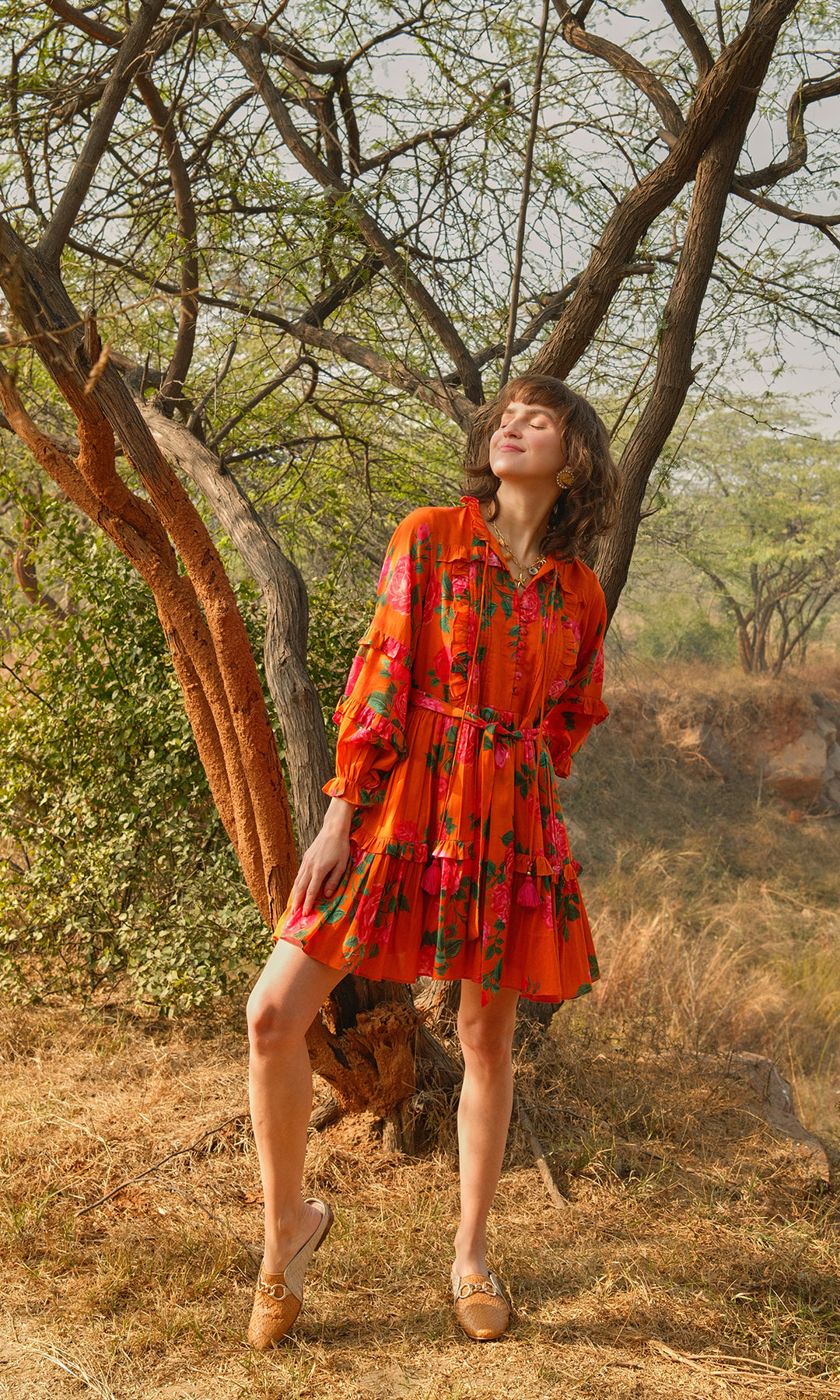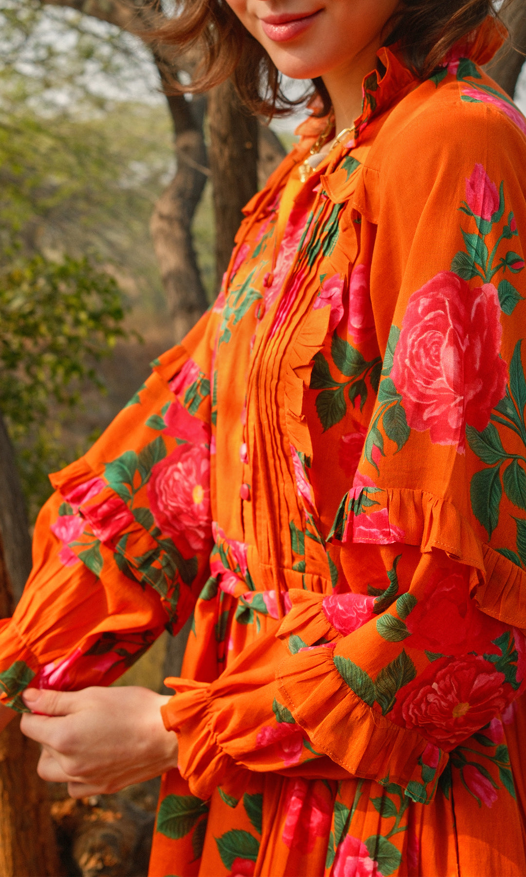 A mulmul digitally printed dress with ruffles and pintucks along the yoke and sleeves. The dress has an attached lining.