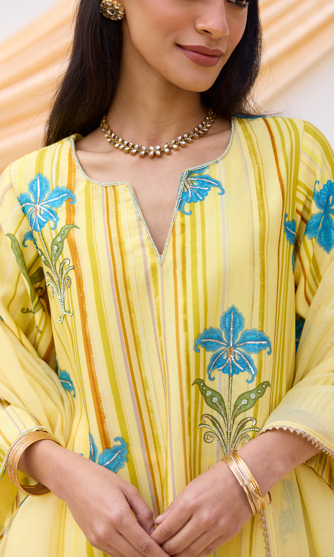 The Chanderi printed kurta, lined with soft mulmul, features delicate hand embroidery on the motifs. It is paired with a modal digitally printed dhoti and finished with a Chanderi dupatta adorned with subtle patchwork for an elegant handcrafted touch.