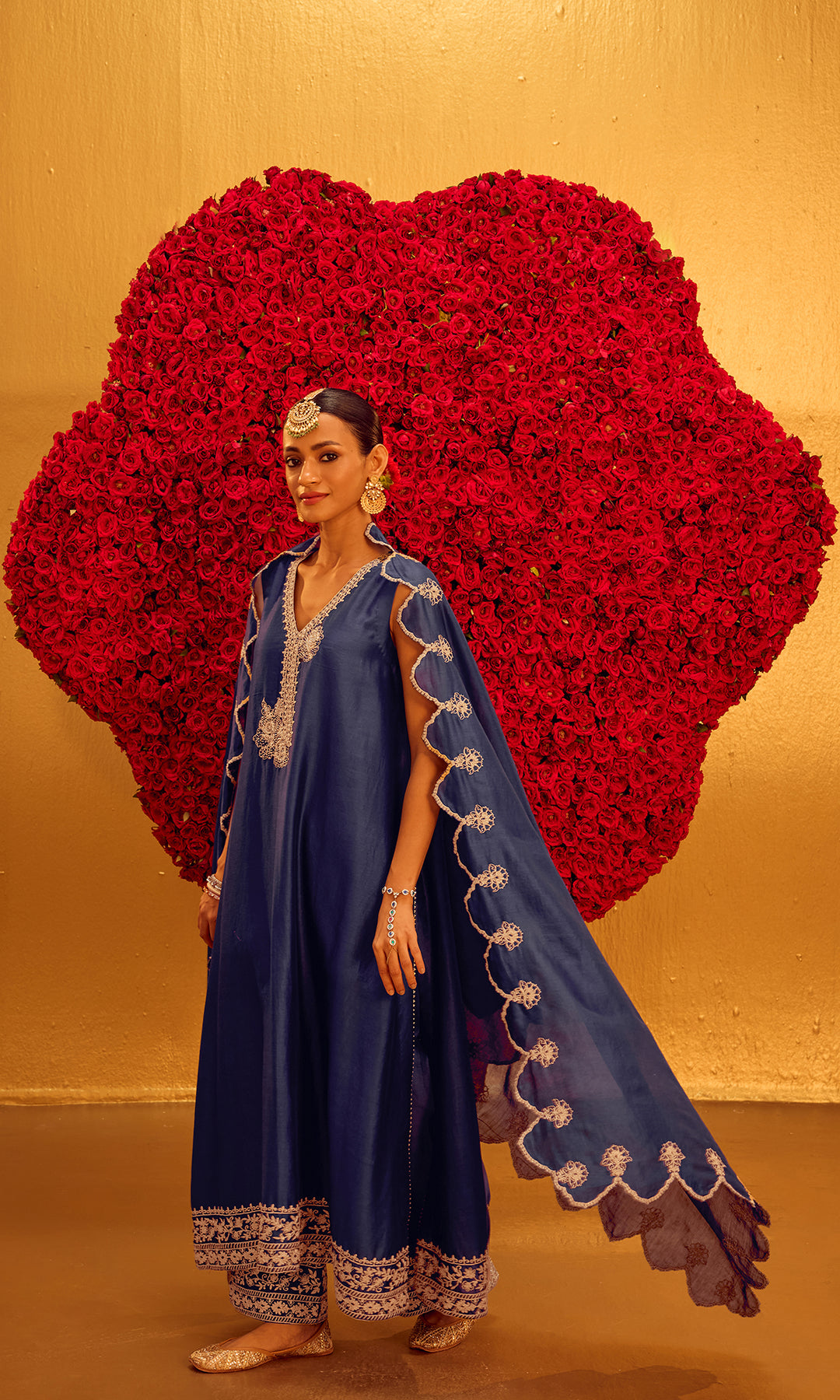 A pure Chanderi A-line kurta adorned with intricate dori and hand embroidery along the neckline and hemline, finished with an attached mulmul lining for comfort. It is paired with straight Chanderi pants featuring delicate embroidery. The look is completed with a scalloped Chanderi dupatta, beautifully embroidered and finished to perfection.