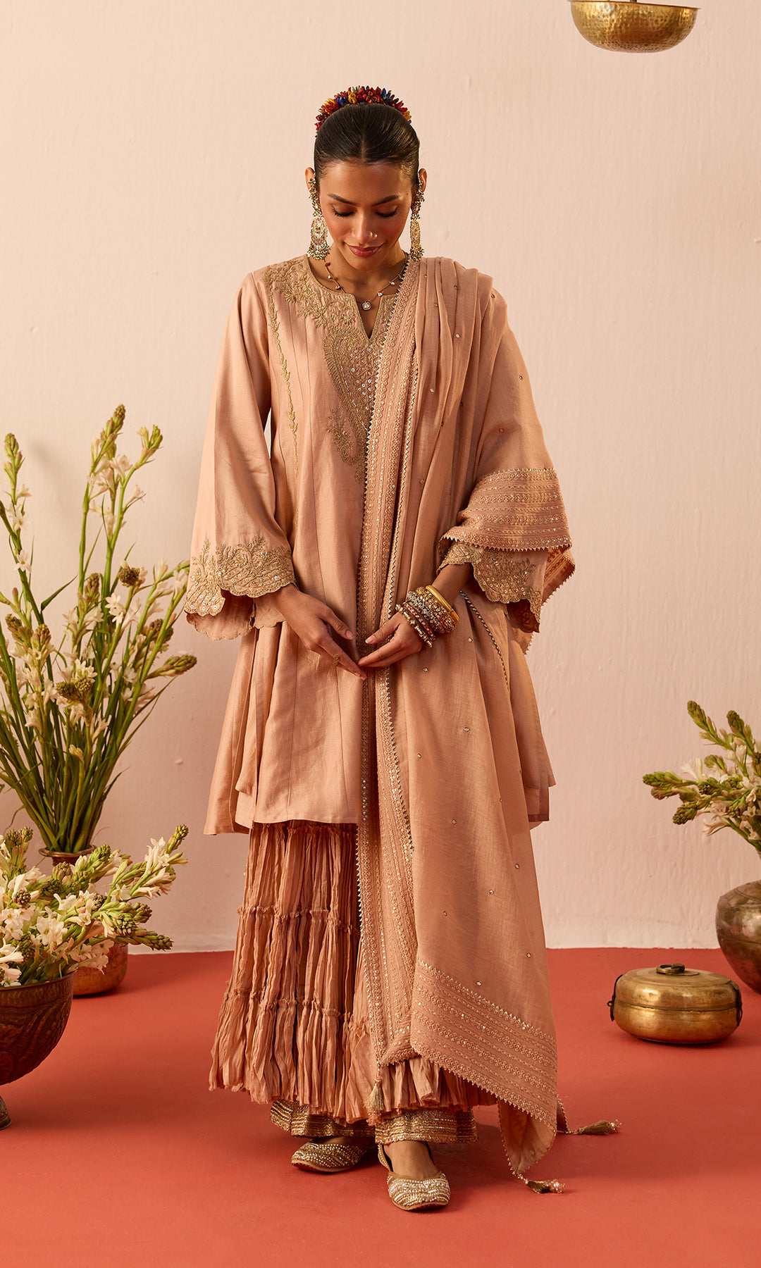 This chanderi short kalidar kurta features a mix of hand and dori embroidery and comes with an attached mulmul lining for comfort. It is paired with a double layered mulmul sharara finished with handmade tassels. The set is completed with a chanderi dupatta featuring tassels and a self embroidered border.