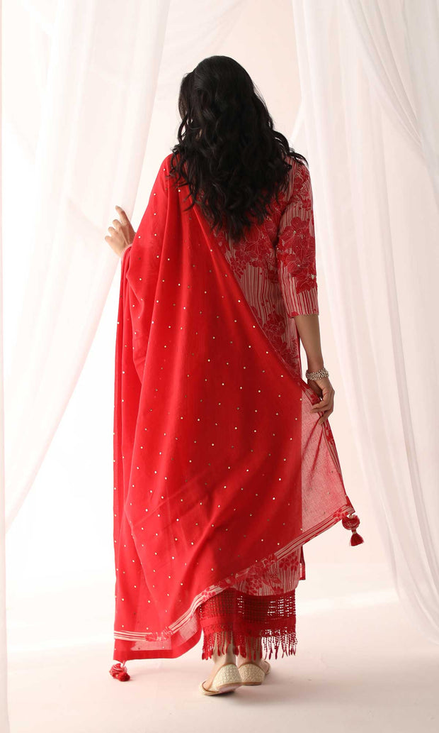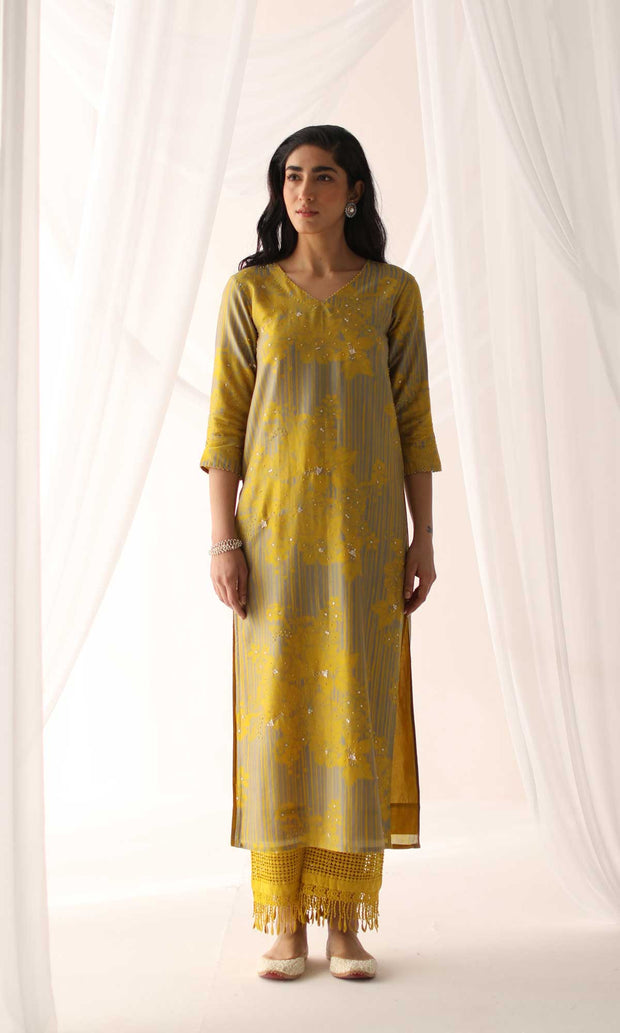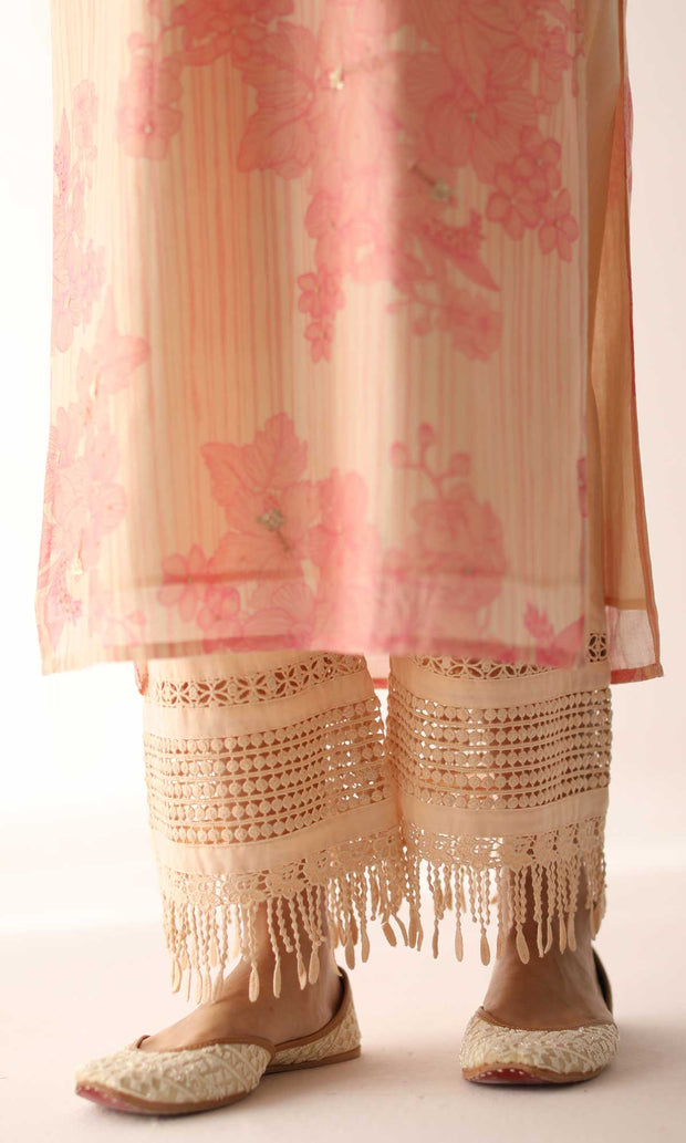 A pure digitally printed chanderi kurta hightlighted with intricate floral embroidery of sequins and beads. It is paired with cotton pants with lace detailing and a mukaish mulmul dupatta.